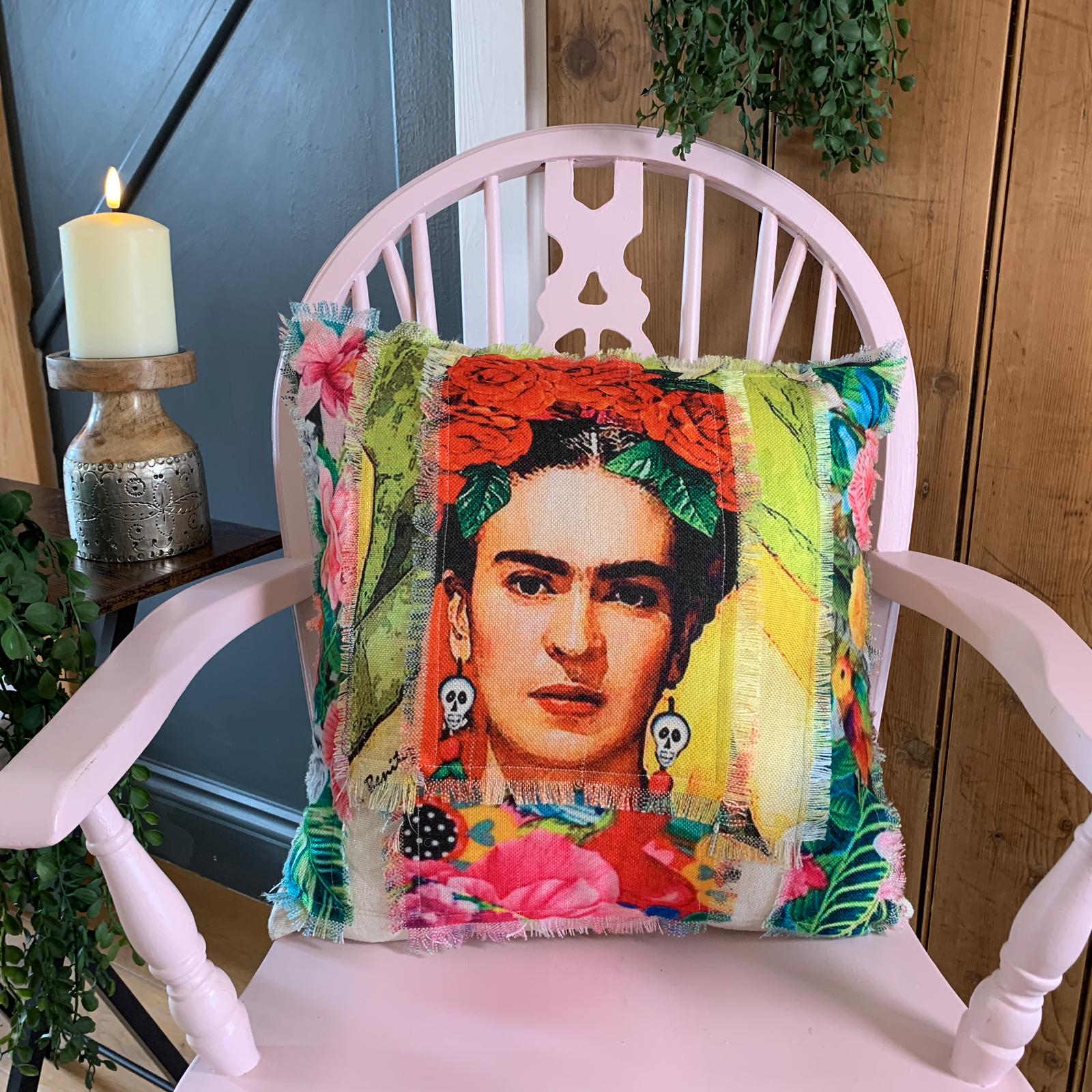 This vibrant throw pillow is a captivating tribute to the iconic Mexican artist Frida Kahlo. The pillow features a striking collage design that showcases two of Frida’s famous self-portraits, rendered in rich colors and intricate details. Her expressive eyes and signature bold brows are brought to life through meticulous craftsmanship.