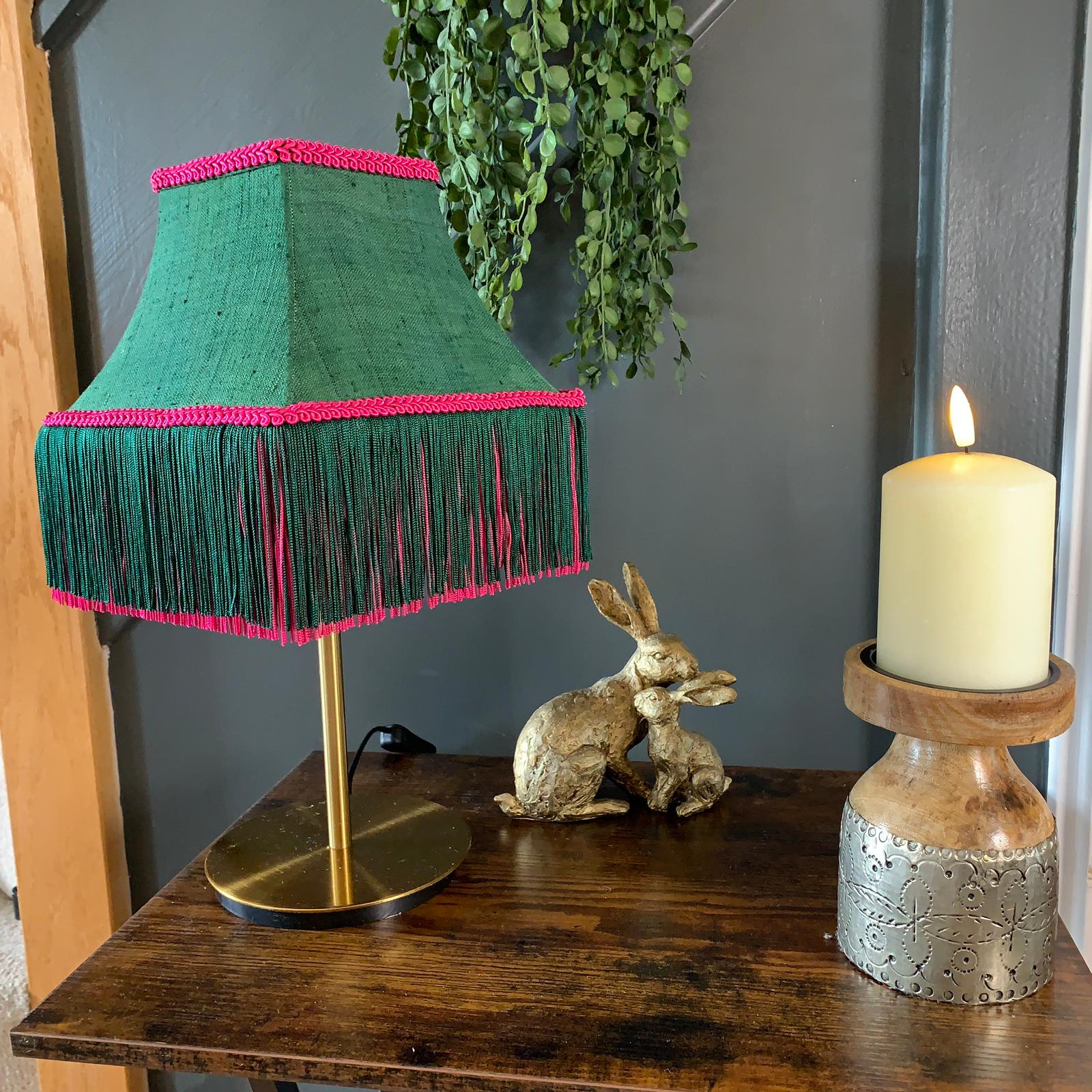 The Cabaret Lampshade is a bespoke, handcrafted lighting accessory that exudes vintage charm and bohemian flair. Crafted from a rich green fabric adorned with a vibrant pink fringed trim, this one-of-a-kind lampshade captivates with its textured design and whimsical elegance.