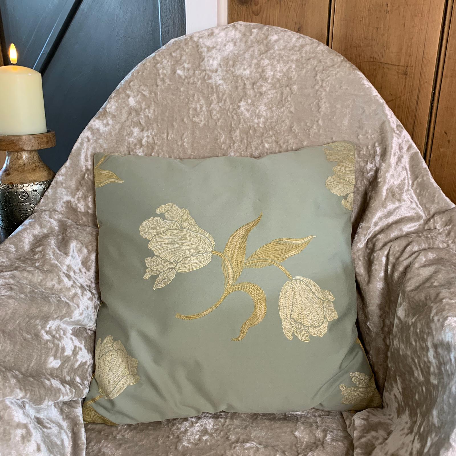 This bespoke decorative pillow features a stunning floral design embroidered in gold thread on a light green background. The intricate floral patterns, vintage tulips, create a beautiful and elegant look that would complement a variety of home decor styles.